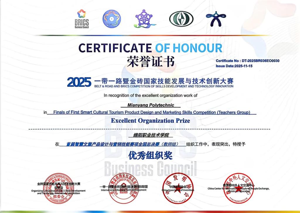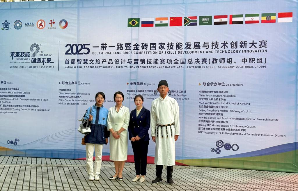 11月11日至13日,2025“一带一路”暨金砖国家技能发展与技术创新大赛首届智慧文旅产品设计与营销技能赛项全国总决赛在广西壮族自治区南宁市落下帷幕,来自全国81支队伍的300余名技能精英同台竞技。经过角逐,公司旅游管理专业群教师杨凌云、张莲洁、王浩淼、张欣慰组成的团队荣获二等奖。公司荣获优秀组织奖。