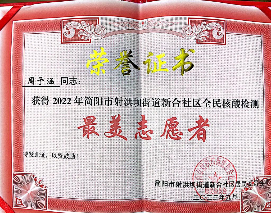 周予涵同学在战“疫”中的优秀表现,获得了服务社区的高度肯定,先后荣获都市沙河街道静康社区颁发的荣誉证书,简阳市射洪坝街道新合社区“最美志愿者”荣誉称号。