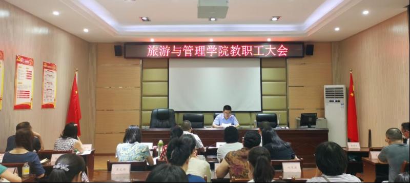 7月19日,旅游与管理公司举行教职工大会,党总支书记苟安经、副经理肖昆、党总支副书记杜鹏、副经理田德刚出席会议。全院教职工参会。