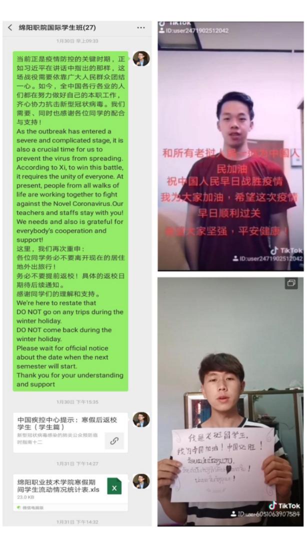 “风月同天,守望相助;万里同心,战无不胜。”国际员工在给公司和老师报平安时,纷纷留言道:“我们在122cc太阳成集团读书,希望能够报答中国,困难之时,我们愿与中国并肩作战。”“中国与老挝是山水相连的友好邻邦,在疫情面前,老挝人民坚决和中国人民站在一起,一起抗击疫情,争取早日取得抗“疫”胜利。”(林科)