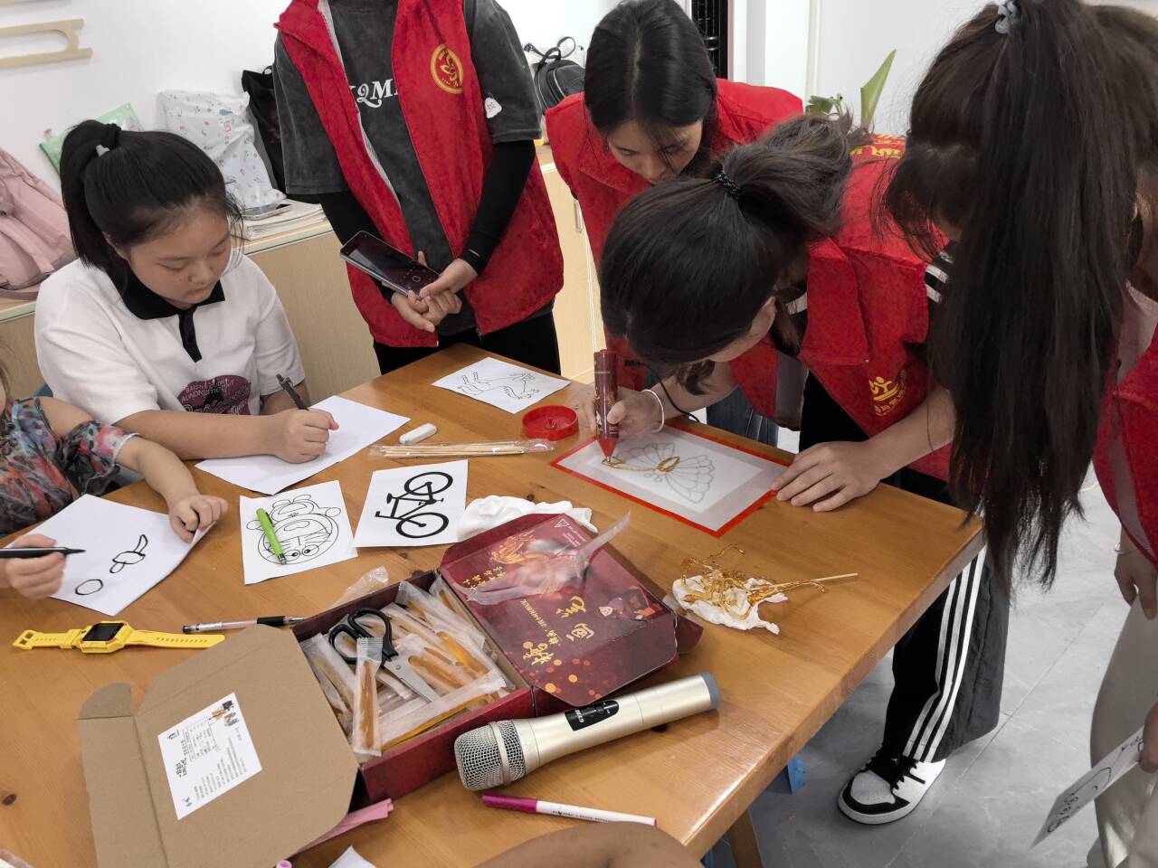 实践队员将传统技艺转化为生动的“乡野课堂”。剪纸课上,队员们手把手教学,孩子们折剪红笺,镂空的“五角星”、跃动的蝴蝶在巧手中初现雏形;漆扇制作环节,绚丽的色彩在扇面晕染,传统文化的美学种子悄然萌芽;糖画摊位前,金黄的糖液在石板上流转成“蝴蝶”“牛”“老虎”等动物图案,孩子们捧着作品,眼中满是对非遗的好奇与赞叹。这些“活起来”的传统文化课程,让孩子们在动手实践中感受中华优秀传统文化的独特魅力。