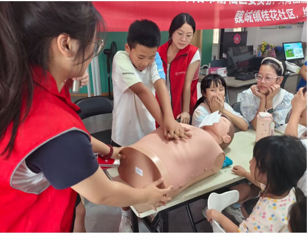 针对暑期儿童安全高发问题,实践团队精心设计“安全小课堂”。防电诈课程通过情景模拟、互动问答,教会孩子们识别“陌生人送礼物”“手机红包诈骗”等常见陷阱;防溺水教学结合当地水域特点,演示“结绳救援法”“空瓶浮力救生” 等实用技巧,并提醒切勿盲目施救;急救知识环节,队员们用模拟道具示范心肺复苏、伤口包扎,孩子们争相体验操作,“安全自护”意识深植心田。